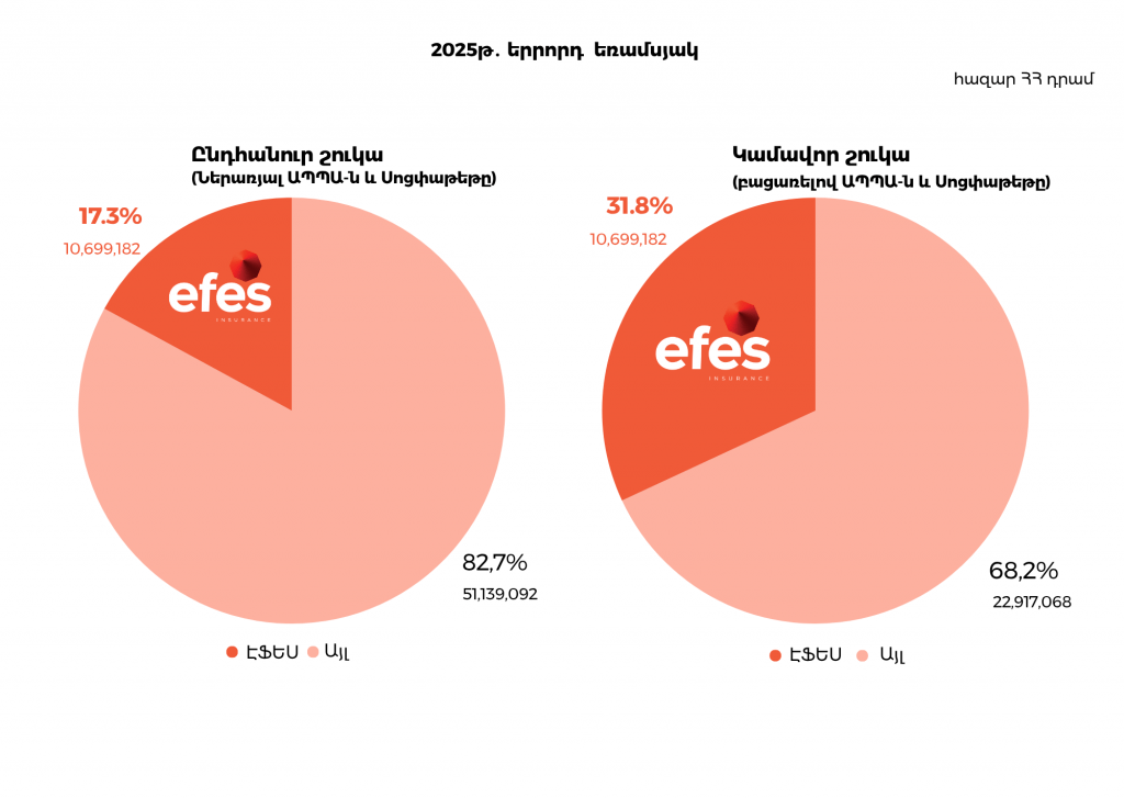 2025 թվականի առաջին ինը ամիսներին «ԷՖԵՍ» ԱՓԲԸ-ն ցուցաբերել է կայուն և հետևողական աճ՝ պահպանելով առաջատարի դիրքերը ինչպես ընդհանուր, այնպես էլ կամավոր ապահովագրության շուկաներում։ Ընկերությունը շարունակել է զարգացնել EFES Online հարթակը և կատարելագործել բջջային հավելվածը՝ ապահովագրական ծառայությունները դարձնելով առավել հասանելի և պարզ։