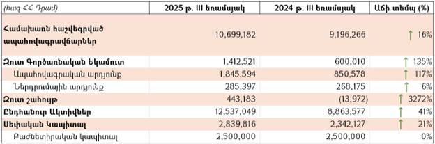 - Նախորդ տարվա համադրելի ժամանակահատվածի համեմատ Ընկերության ընդհանուր ակտիվներն աճել են 40%-ով՝ կազմելով 12.5 մլրդ դրամ։