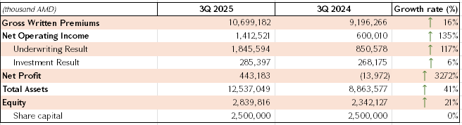 - As of the 9 months of 2025, the company’s insurance premium portfolio increased by 16% compared to the same period last year, reaching AMD 10.7 billion.